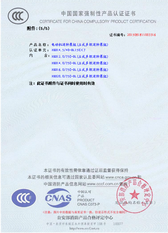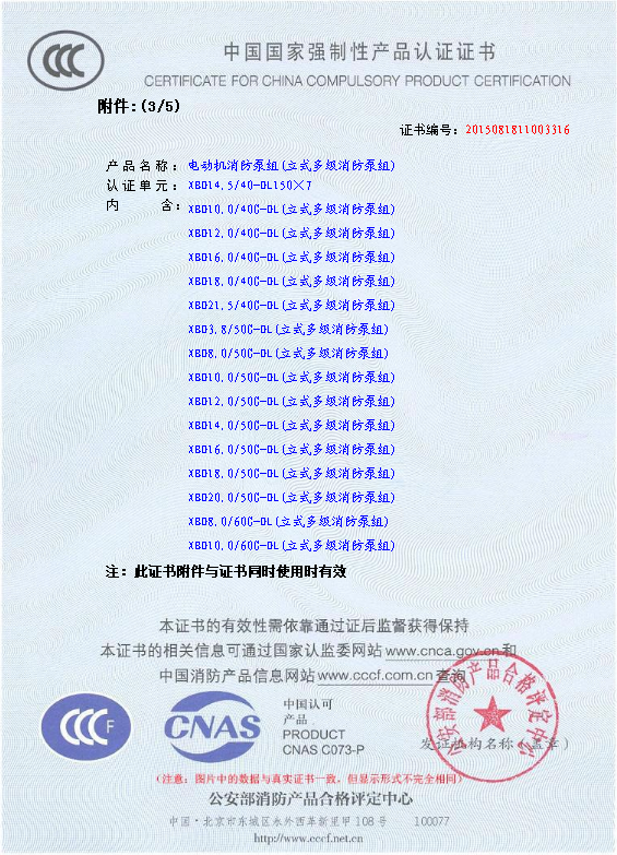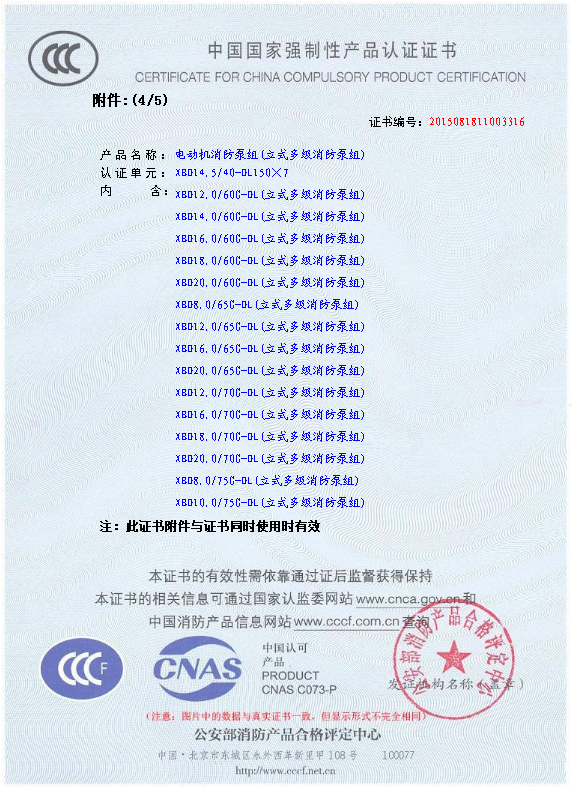 目前,龍巖市九龍水泵制造有限公司有二百多個(gè)型號(hào)的消防產(chǎn)品通過(guò)國(guó)家CCCF認(rèn)證,且證書(shū)已經(jīng)發(fā)至公司。本批獲證的產(chǎn)品分別是:立式多級(jí)消防泵組、多級(jí)泵流量50-75L/S,揚(yáng)程38-200m; 隨著新一批CCCF證書(shū)的到來(lái),九龍水泵消防產(chǎn)品的證書(shū)更加齊全,覆蓋的產(chǎn)品類型也更廣,也是全體九龍人為生命工程制造好產(chǎn)品的體現(xiàn)。未來(lái),龍巖市九龍水泵制造有限公司將繼續(xù)依照國(guó)家消防規(guī)定,做好消防產(chǎn)品強(qiáng)制性認(rèn)證及管理工作,維護(hù)產(chǎn)品安全和社會(huì)安全。
