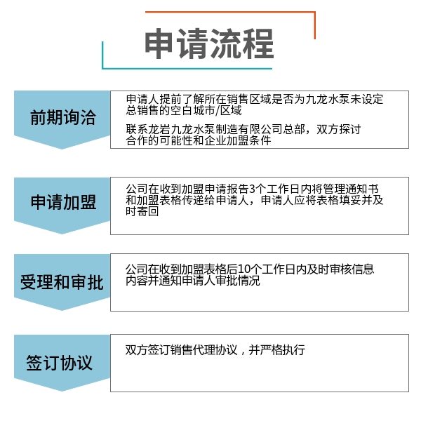 為拓寬公司的銷售渠道,公司誠招各地銷售代理商。我們誠邀世界各地有興趣、有信譽、有實力、有能力、愿與龍巖九龍水泵制造有限公司共同發(fā)展的單位和個人加盟九龍水泵的營銷網(wǎng)絡,共創(chuàng)美好未來。