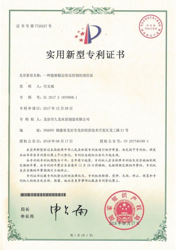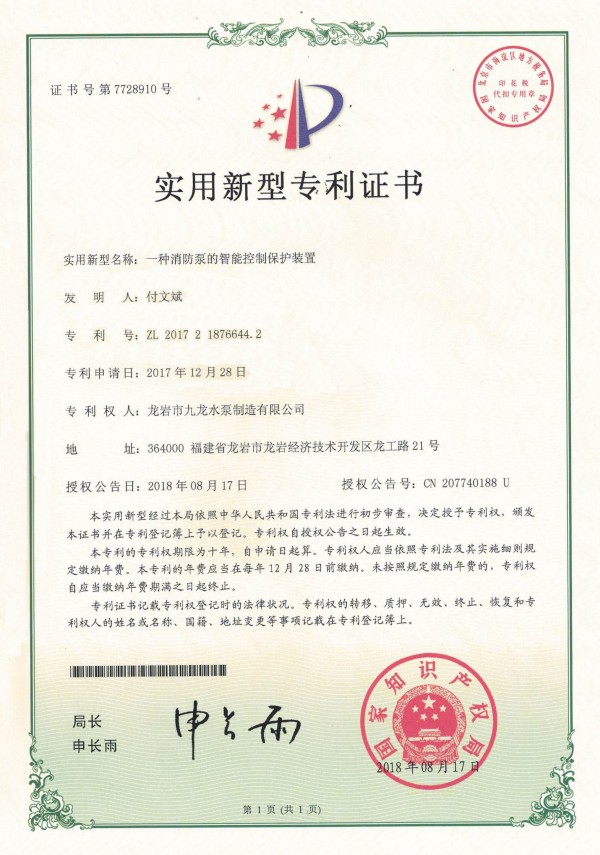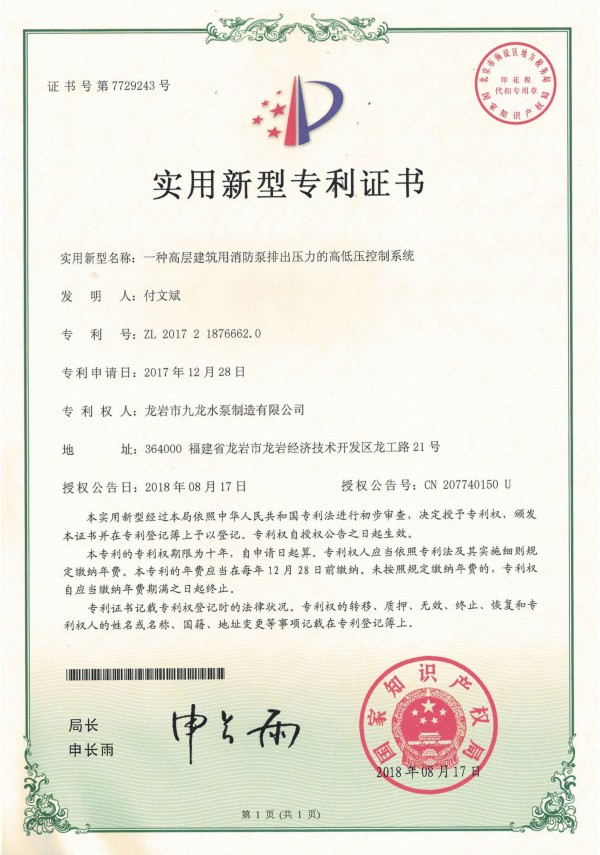 給水設(shè)備(全數(shù)字變額)外觀設(shè)計(jì)專利證書